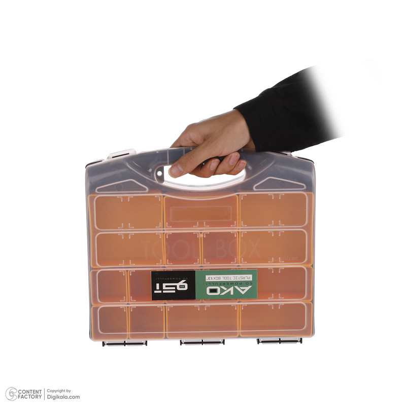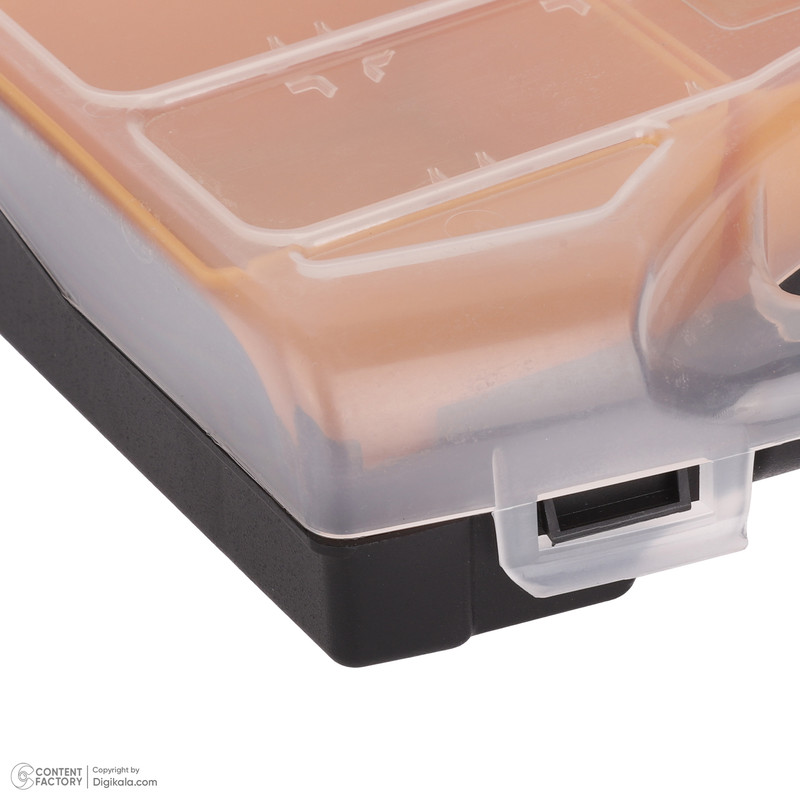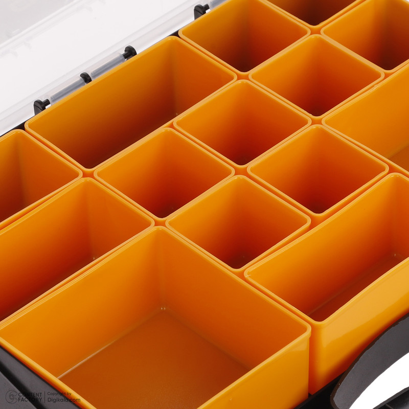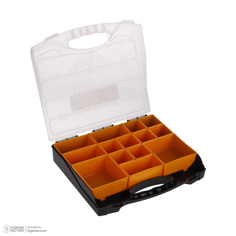 این جعبه دارای یک طبقه و یک محفظه کالا است که امکان نگهداری منظم ابزارها را فراهم میآورد. جنس آن از پلاستیک باکیفیت تهیه شده که دوام آن را افزایش داده و از آسیب دیدن ابزارها در هنگام حمل و نقل جلوگیری میکند.