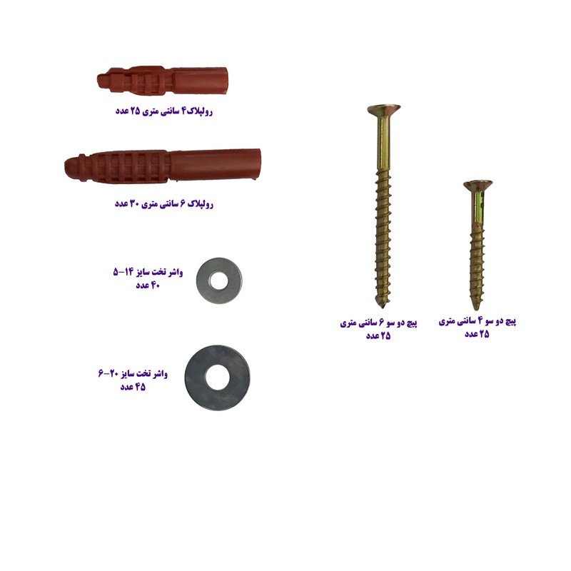 این مجموعه شامل دو سایز پیچ و رولپلاک به سایزهای 6 و 4 سانتی متر و دو مدل واشر به سایزهای M6-20 و M5-14 می باشد که با توجه به پر مصرف بودن سایز های موجود در بسته بندی نیاز اکثر افراد در جهت انجام کارهای فنی خانه و محل کار را برطرف و آسان میکند.