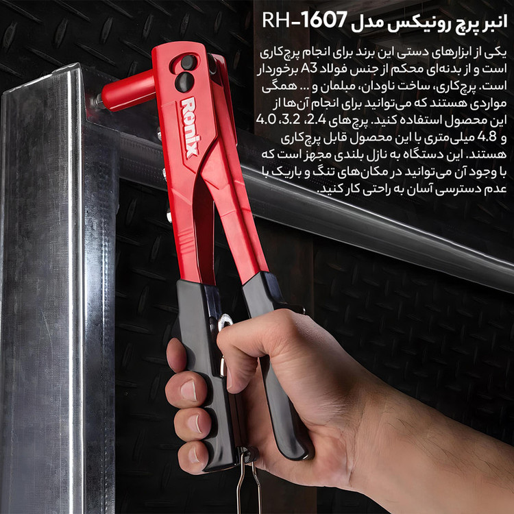 قطعات فولادی مقاوم، پشتیبانی از میخ پرچ های 2,4 تا 4,8 میلی متر، دسته های روکش شده با PVC، قابلیت پرچ کاری انواع میخ های از جنس استیل و آلومینیوم، ضد لغزش و ضد تعریق