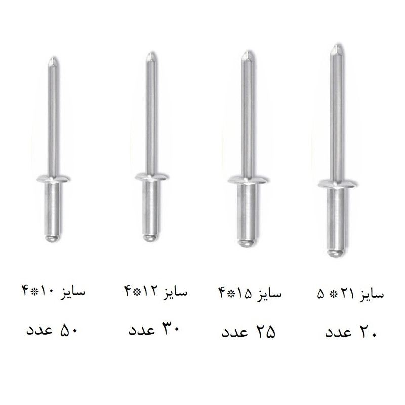 سایر توضیحات : تعداد 125 عدد میخ پرچ آلومینیومی شامل 50 عدد میخ پرچ سایز 4x10 ، 25 عدد سایز 4x15 ، 30 عدد سایز 4x12 و 20 عدد سایز 5x21 در ظرف درب دار تقدیم میگردد.