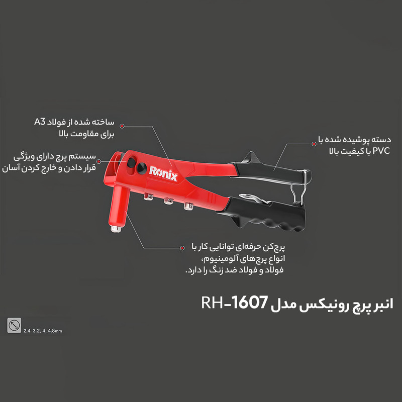 مشخصات اصلیرنگ / چند رنگ / مشکی / قرمزمشخصات فرعیوزن800 گرمتعداد سری4جنس بدنه کالاA3 استیلویژگیهای انبر پرچآچار , قفلابعاد18x10x2 سانتیمتر
