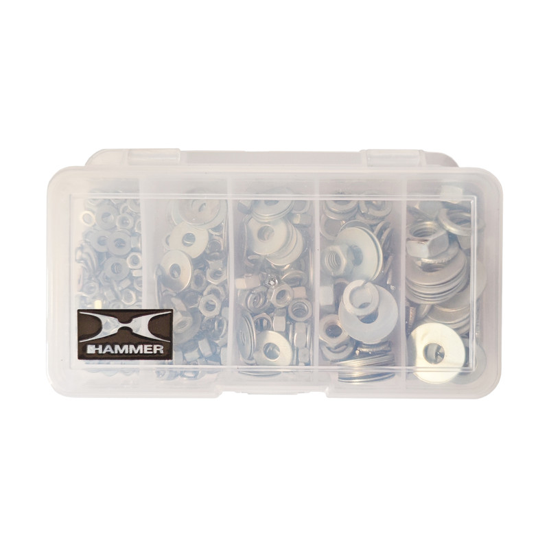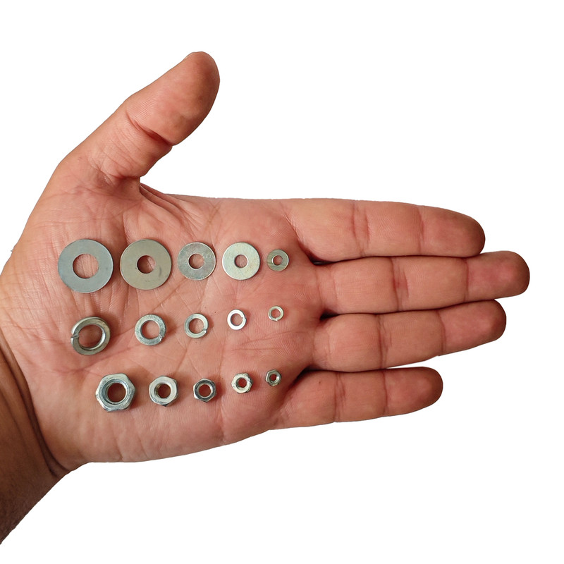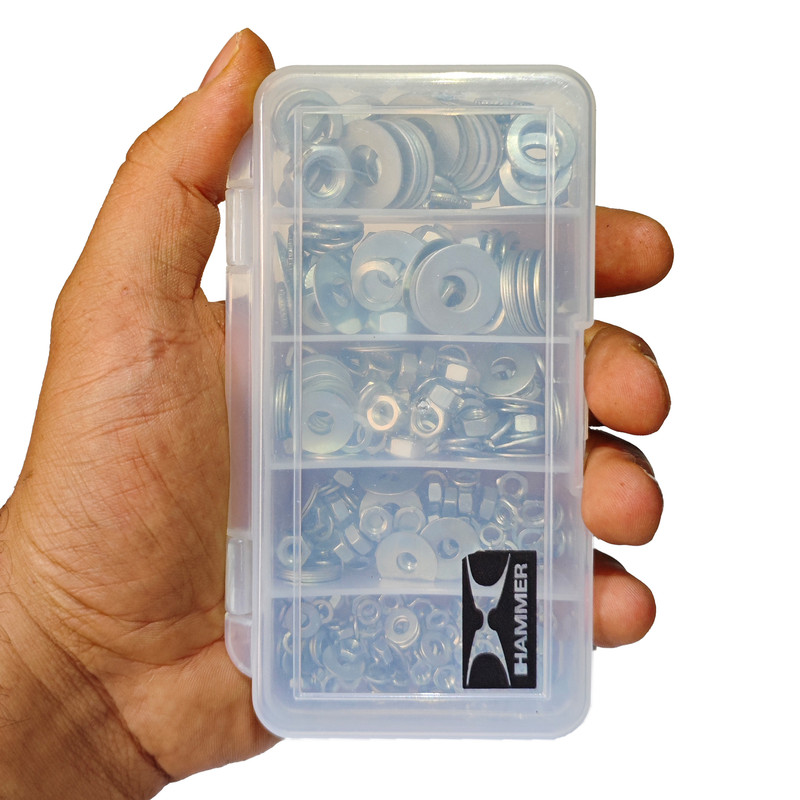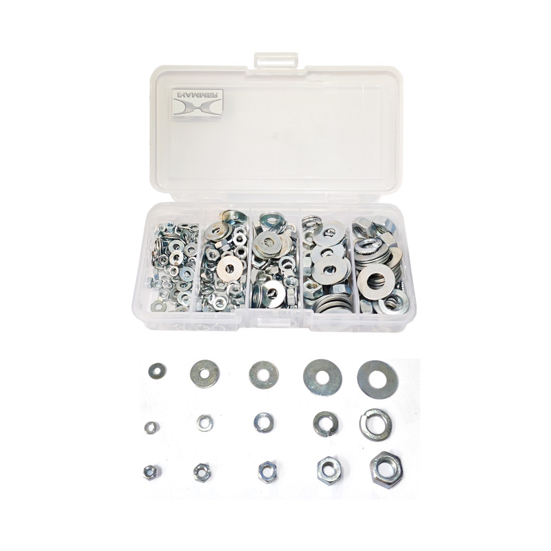 مهره شش ضلعی و واشر تخت و واشر فنری هامر بسته 345 عددی شامل 5 سایز مختلف مهره آهنی آبکاری شده نقره ای و واشر فنری و تخت آبکاری شده در یک ظرف مخصوص میباشد که سایز های M3 به تعداد 90 عدد ، M4 به تعداد 90 عدد ، M5 به تعداد 90 عدد ، M6 به تعداد 45 عدد ، M8 به تعداد 30 عدد در این مجموعه قرار دارند.