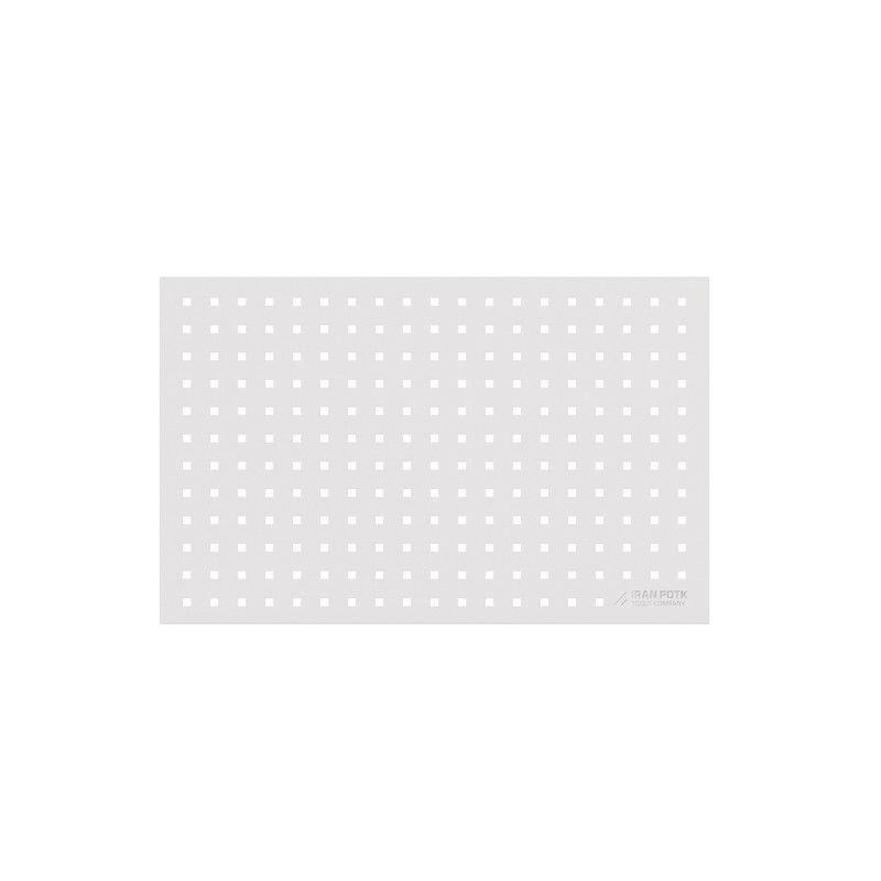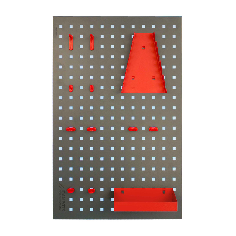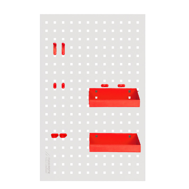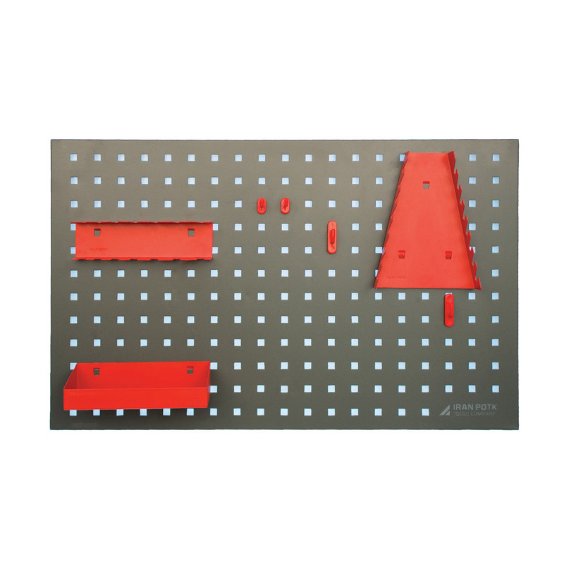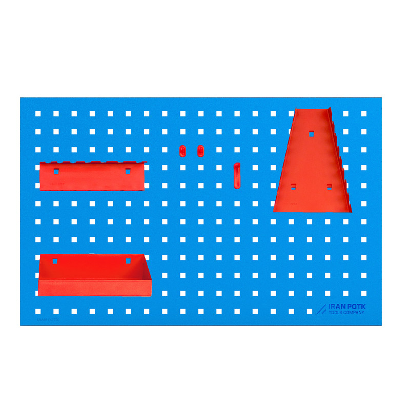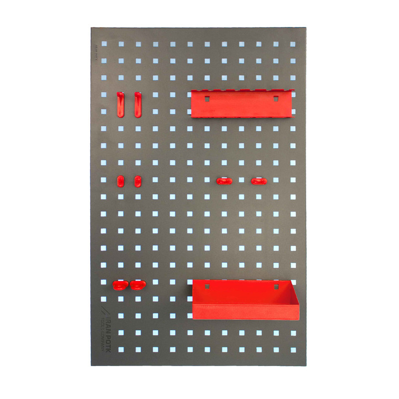 تابلوی نمایش ابزار ایران پتک، محصولی جدید از شرکت ایران پتک می باشد. صفحه این تابلو از ورق فولادی با ضخامت 0/8 میلی متر ساخته شده و با رنگ پودری پوشش داده شده است. این تابلو قابلیت استفاده در فضاهایی مانند پارکینگ، فروشگاه، انبار، منزل و ... را دارد. فرآیند نصب این تابلو بسیار ساده می باشد. این تابلو در سه رنگ طوسی روشن، طوسی تیره و آبی عرضه می شود. امکان ایجاد فضای بیشتر جهت آویز ابزار با تهیه و نصب چند تابلو به صورت افقی و یا عمودی وجود دارد. اقلام همراه این تابلو شامل 14 عدد قلاب پلاستیکی، نگهدارنده پیچ گوشتی، نگهدارنده آچار تخت، پالت فلزی، پیچ و رولپلاک و راهنمای نصب می باشد. این مجموعه شامل ابزار نمی باشد.