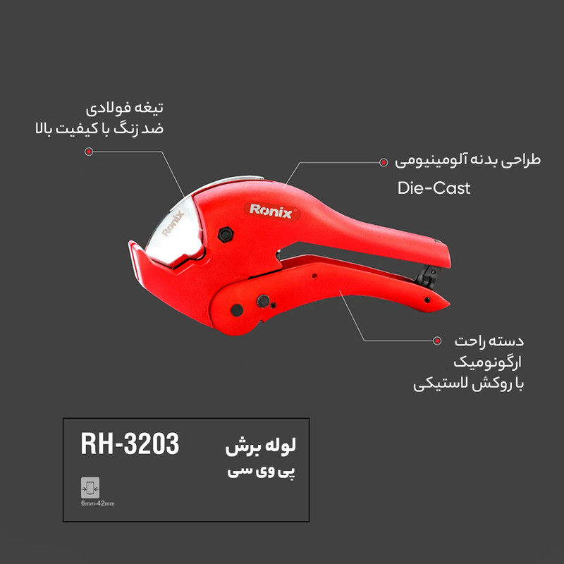 قیچی لولهبر مدل RH-3203 یک انتخاب مناسب برای تهیه این ابزار و برش لولههای پلاستیکی محسوب میشود. این مدل ازجملهی محصولات شرکت «رونیکس» (Ronix) به شمار میآید. این شرکت ابزار را در گونههای مختلفی تولید کرده که این قیچی یکی از آنها است. این مدل دارای تیغهای برنده دارد که برای برش انواع لولههای پلیمری به کار میرود. این مدل با ابعاد 105 × 225 سانتیمتر ساخته میشود. تیغههای این قیچی از فولاد ضدزنگ ساختهشده و به کمک آن میتوانید لولههای تا قطر 42 میلیمتر را برش دهید. برای استفاده از قیچی لولهبر مهارت خاصی لازم نیست و بهراحتی میتوان از آن استفاده کرد. شرکتهای تولیدکننده این مدل برای حفاظت از این وسیله، ضامن یا قفلی برای بسته ماندن تیغه در نظر گرفته است. از این قیچی در لولهکشی (لولههای پلیمری) استفادهی زیادی میکنند. این محصول حجم کمی از جعبهی ابزار را اشغال میکند. برش لوله پلاستیکی (PVC) کاری است که اگر با اره دستی انجام شود، چندان راحت نیست. در بعضی مواقع هم امکان استفاده از اره دستی وجود ندارد؛ ازجملهی این دلایل میتوان به فضای کاری کم اشاره کرد. استفاده از دستگاه برش برقی هم برای این کار چندان منطقی و مقرونبهصرفه به نظر نمیرسد. در این صورت استفاده از قیچیهای لولهبر یکی از گزینههای برای رفع مشکل و انجام دادن کار است. مدل RH-3203 یکی از قیچیهای لولهبری است که شرکت نووا تولید کرده است. به کمک این قیچی و تیغههای فولادی آن، قادر هستید لولههای پلیمری را تا قطر 42 میلیمتر برش دهید.