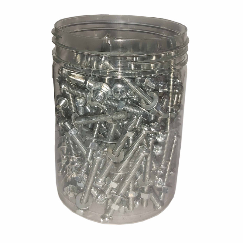 167 عدد پیچ استوانه ای 4 سانتی متری و 167 عدد مهره و 167 عدد واشر در داخل جار (قوطی پلاستیکی) قرار داده شده اند.