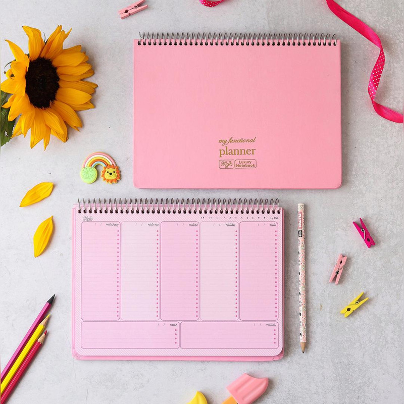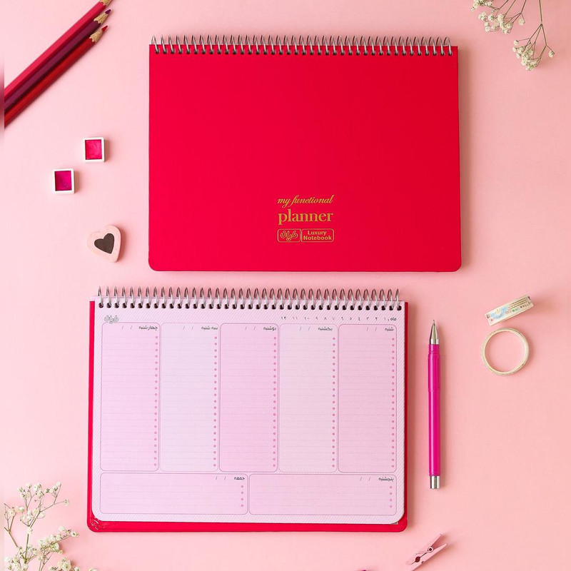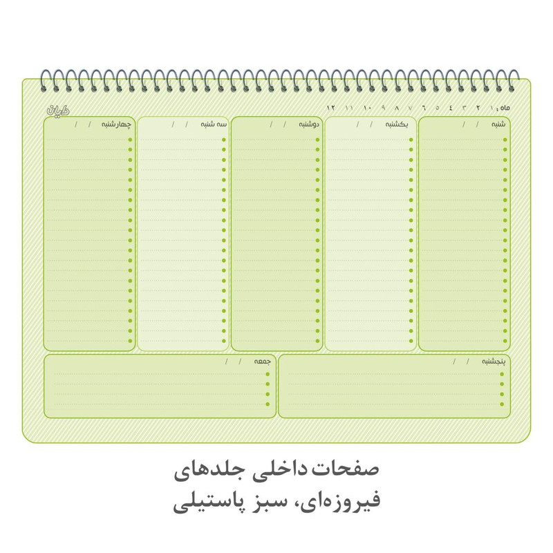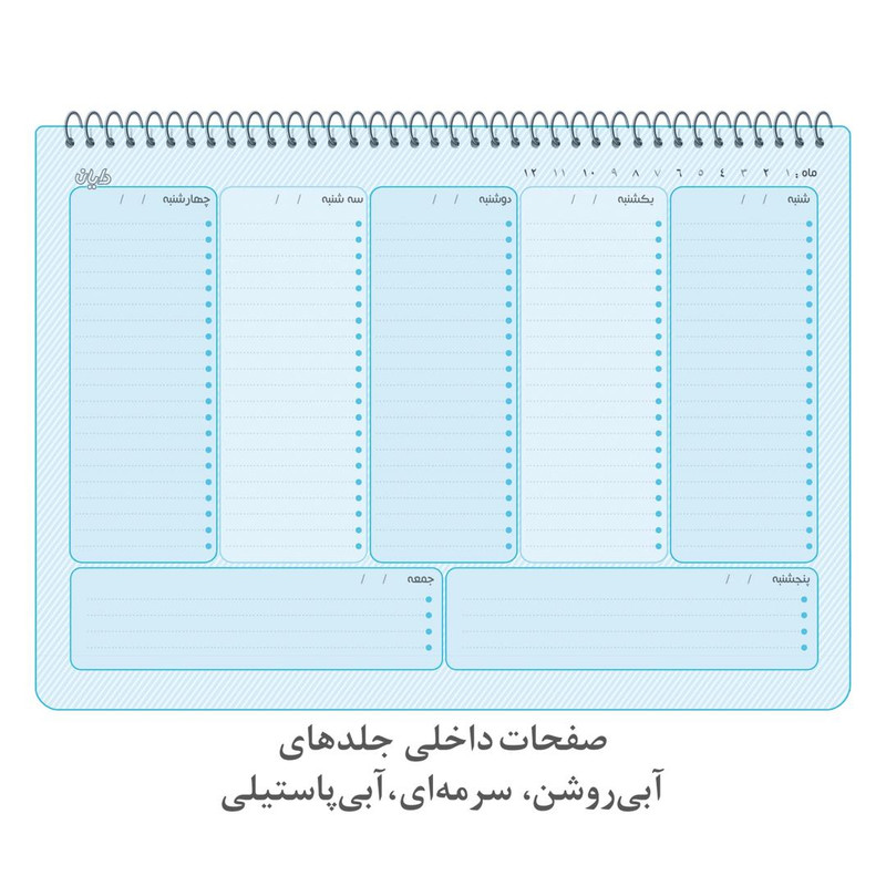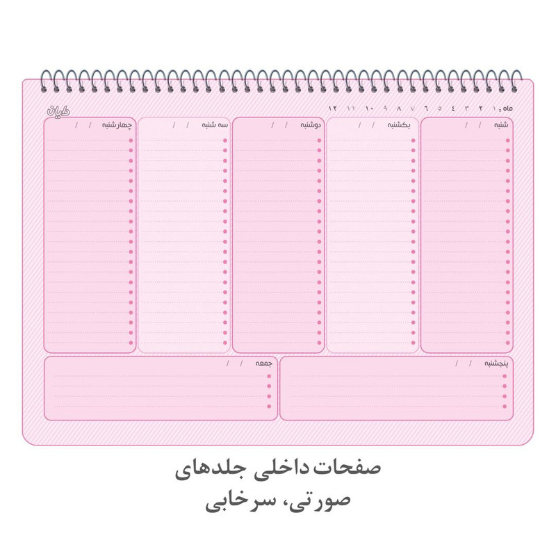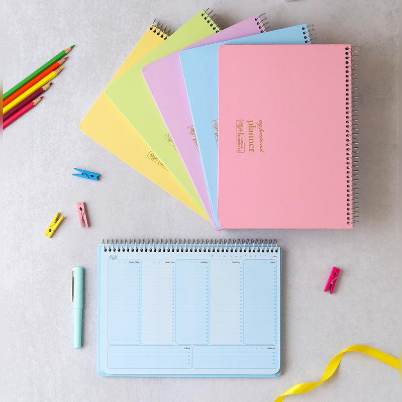 دفتر برنامهریزی هفتگی دایان با طراحی منحصر به فرد خود، انتخابی ایده آل برای علاقه مندان به نظم دهی هفتگی است. جلد سخت و باکیفیت این دفتر با رنگهای پاستلی ملایم مانند صورتی، آبی و سبز تا رنگهای گرم بهاری مانند بنفش،آبی کاربنی و....، فضایی آرامشبخش خلق میکند. نقوش طلاکوب روی جلد جلوهای لوکس و مدرن به آن میبخشد.