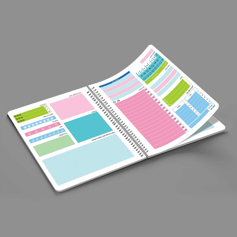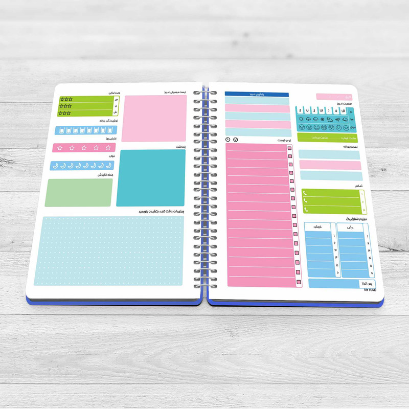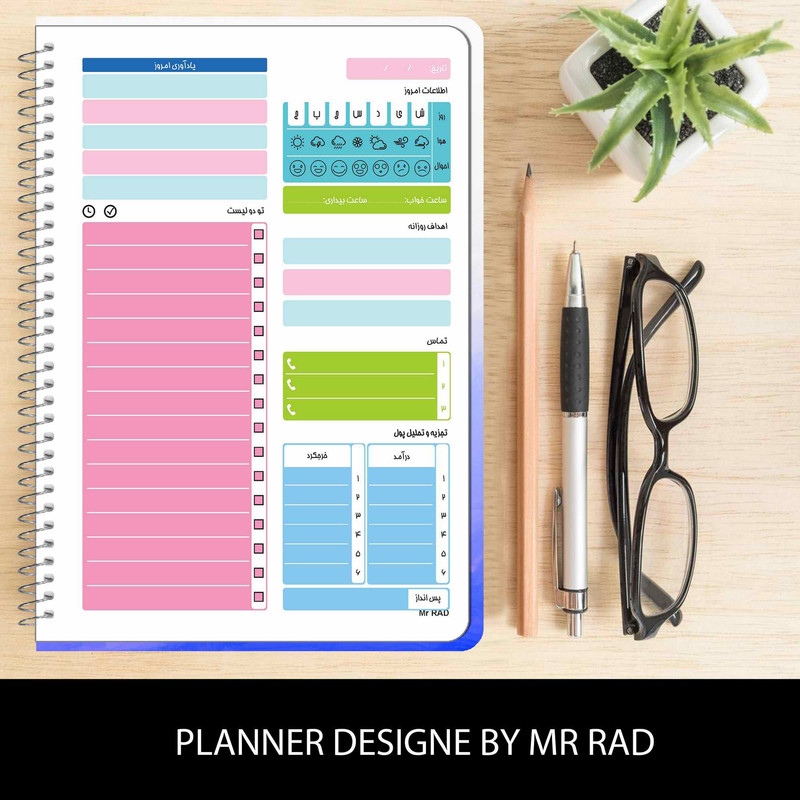 مستر راد با تیمی مجرب از متخصصین صنعت چاپ اقدام به تهیه دفتر، دفترچه لغت، پلنر، کاغذ، تو دو لیست، to do list و ... در سایزهای متفاوت نموده که مناسب همه عاشقان لوازم تحریر، دفتر ، کتاب و همه کسانی که بنا به موقعیت تحصیل یا شغلشان با دفتر و نوشت افزار زیاد سرو کار دارند و به دنبال موفقیت در اهداف خود هستند ، برای خرید دفتر به خصوصیات دفتر اعم از کیفیت کاغذ، جنس، دوام، ماندگاری، طراحی جلد، طراحی صفحات، نوع صحافی ، تعداد صفحات، قطع و اندازه دفتر و…توجه و پس از بررسی کامل خرید میکنند. دفتر برنامه ریزی مستر راد طرح شب مهتاب مدل پلنر روزانه شامل 75 برگ در ابعاد 20x15(A5) می باشد که این دفتر هم پلنر( دفتربرنامه ریزی) و هم تودو لیست to do list هست که با طراحی زیبا و رنگارنگی که دارد شامل بخش های کاربردی و روزانه ی تاریخ روز، اطلاعات روز، یادآوری روز، ساعت خواب وبیداری، تودولیست، لیست تماسها، میزان درآمد و پس انداز، اهداف روزانه است و در صفحه مقابل این دفتر کادرهایی با عنوان لیست موسیقی امروز، وعده های غذایی، نوشیدن آب، ارزیابی روز، جمله انگیزشی، یادداشت و بخش جذاب و نقطه چین(چیزی را یادداشت کنید، بکشید یا بنویسید) که فضایی مناسب برای ترسیم اشکال، چسباندن استیکر یا برچسب و ...و یا یادداشت خاص و شخصی است و برای استفاده همه سنین انتخاب مناسبی است.این دفترچه یادداشت با طراحی رنگارنگی که دارد به شما نشاط می بخشد و همچنین به شما کمک میکند با نوشتن نکات مهم و کلیدی روزانه بدون استرس و فراموشی امور، بابرنامه ای دقیق نهایت استفاده از روز را داشته باشید. مزیت رقابتی دفترهای مستر راد نسبت به سایر دفترها، علاوه بر وزن بالای کاغذ و کیفیت جلد که محافظ خوبی برای کاغذها است ، فنری یا سیمی بودن صحافی آن است. سیمیبودن دفتر در عین اینکه به شما امکان میدهد در صورت نیاز برگهای را از آن جدا کنید و به خوبی برگه ها را در کنار هم قرار میدهد.