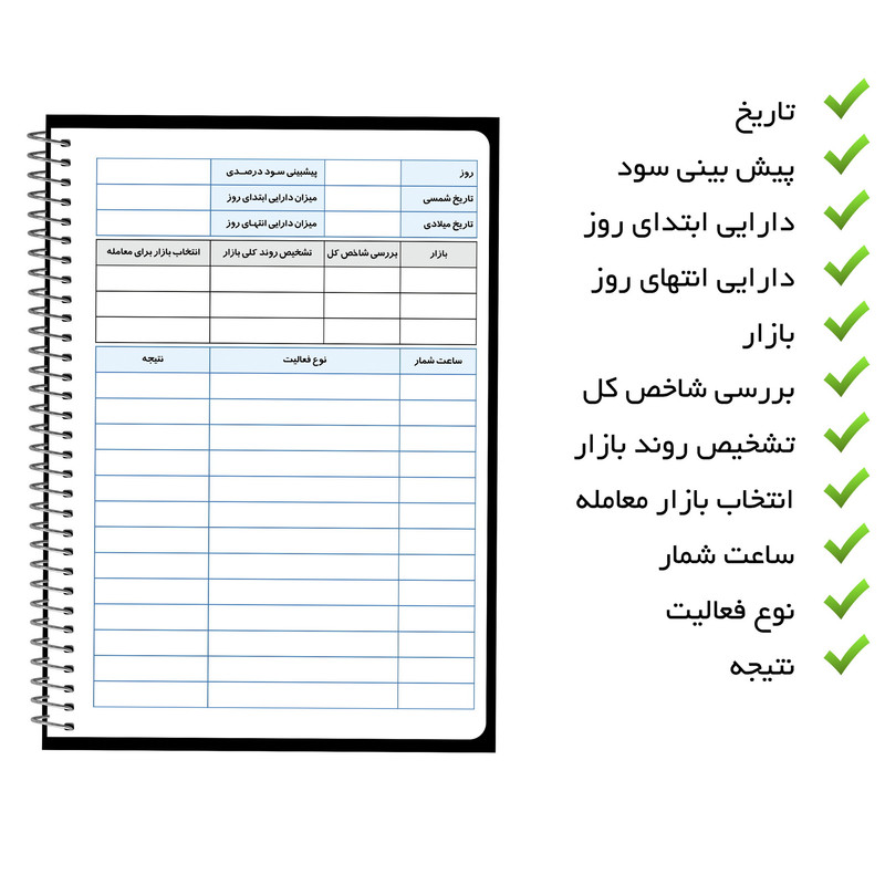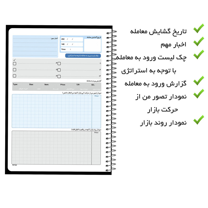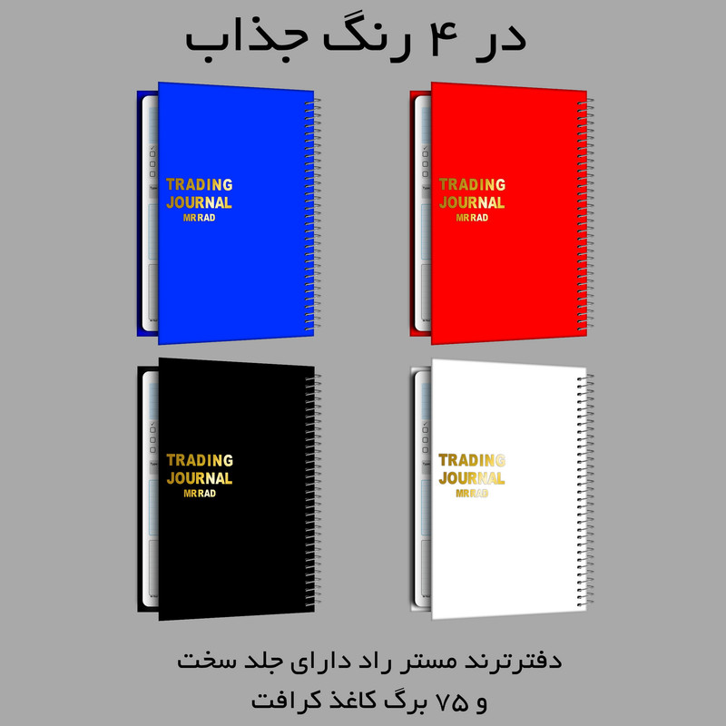 مستر راد با تیمی مجرب از متخصصین صنعت چاپ اقدام به تهیه دفتر، دفترچه لغت، پلنر، کاغذ، تو دو لیست، to do list و ... در سایزهای متفاوت نموده که مناسب همه عاشقان لوازم تحریر، دفتر ، کتاب و همه کسانی که بنا به موقعیت تحصیل یا شغلشان با دفتر و نوشت افزار زیاد سرو کار دارند و به دنبال موفقیت در اهداف خود هستند ، برای خرید دفتر به خصوصیات دفتر اعم از کیفیت کاغذ، جنس، دوام، ماندگاری، طراحی جلد، طراحی صفحات، نوع صحافی ، تعداد صفحات، قطع و اندازه دفتر و…توجه و پس از بررسی کامل خرید میکنند. دفتر برنامهریزی معاملات بورس مستر راد مناسب اشخاصی است که به دنبال موفقیت در معاملات بورسی خود هستند. طبق تجربه افراد موفق، در این زمینه، انعطاف پذیری و برنامه ریزی مهمترین عامل در رسیدن شما به قله موفقیت میباشد چرا که سازمان دهی و برنامه ریزی به شما کمک میکند به درستی، تمرکز و بادقت تصمیم گیری و انتخاب کنید. دفتر معاملاتی مستر راد طرح تِریدر با داشتن بخش های کاربردی تاریخ، پیشبینی سود، دارایی ابتدای روز، دارایی انتهای روز، بازار، بررسی شاخص کل، تشخیص روند بازار، انتخاب بازار معامله، ساعت شمار، نوع فعالیت، نتیجه و صفحه مقابل این دفتر شامل تاریخ گشایش معامله، اخبار مهم، چک لیست ورود به معامله با توجه به استراتژی، گزارش ورود به معامله، نمودار تصور من از حرکت بازار، نمودار روند بازار میباشد. این دفتر در چهار رنگ زیبای قرمز، سفید، سورمهای و مشکی است. ابعاد این دفتر (20x14/5) هست و دارای 75 برگ است. فراموش نکنید نظم و دقت و تمرکز از شما یک کاربر و فعال بورسی موفق میسازد. در این راه مستر راد با فراهم آوردن بستر مناسب جهت برنامه ریزی و ساماندهی امور همراه مناسبی برای شماست.