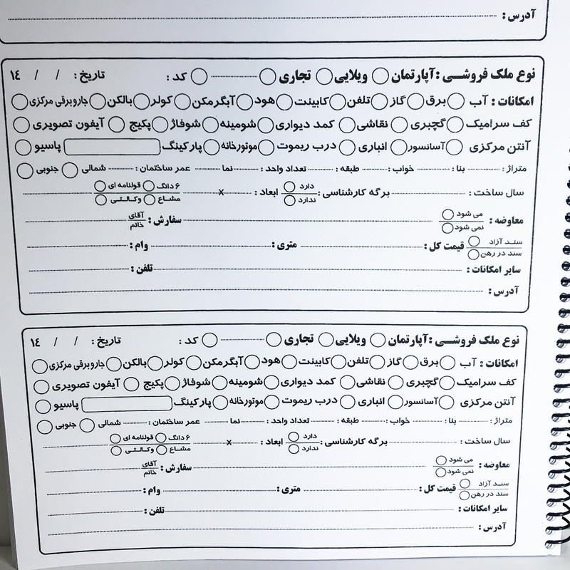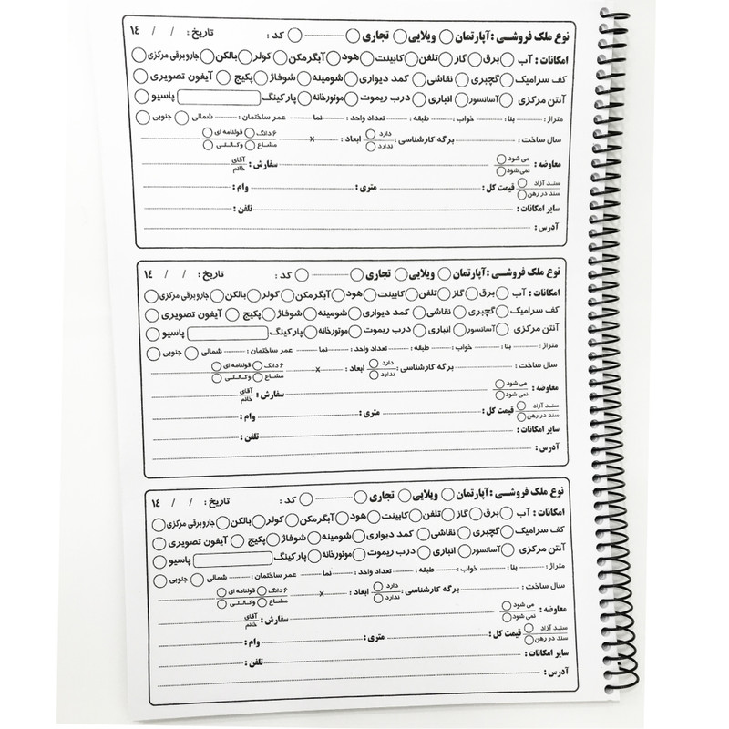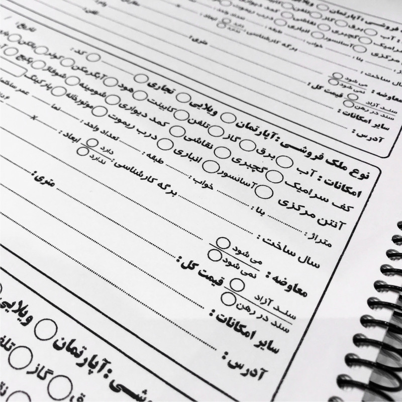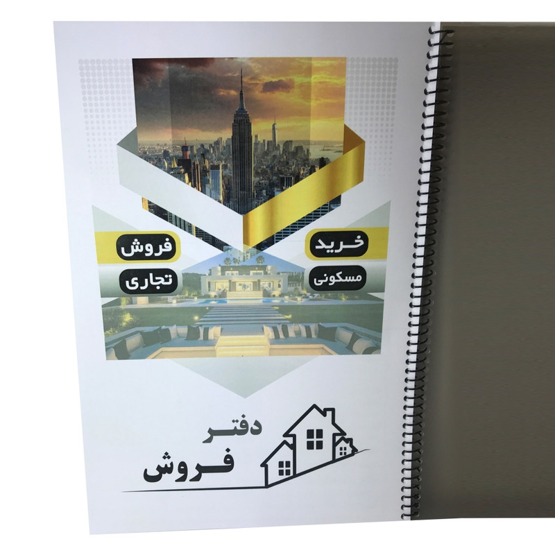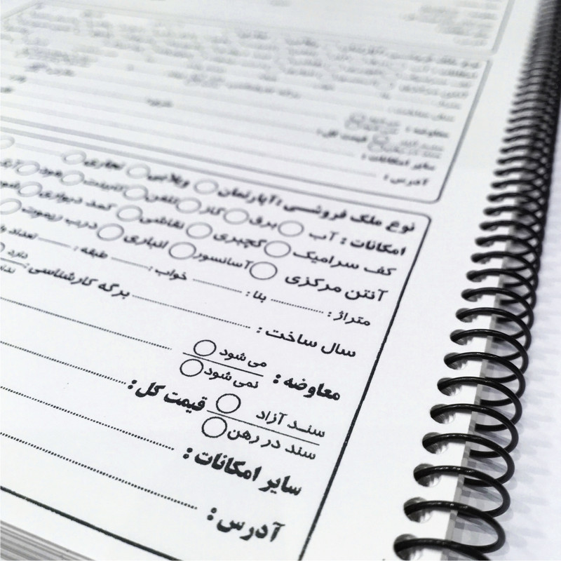 دفتر ثبت مشاورین املاک به صورت فنر بندی شده (فنر فلزی) همراه با طلق ضخیم 50 میکرون ارائه می گردد.