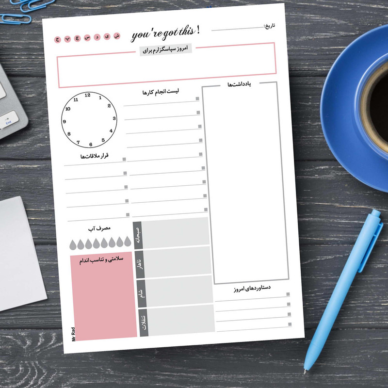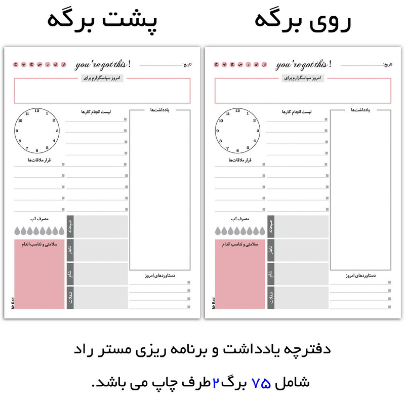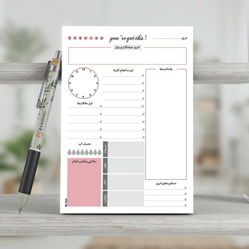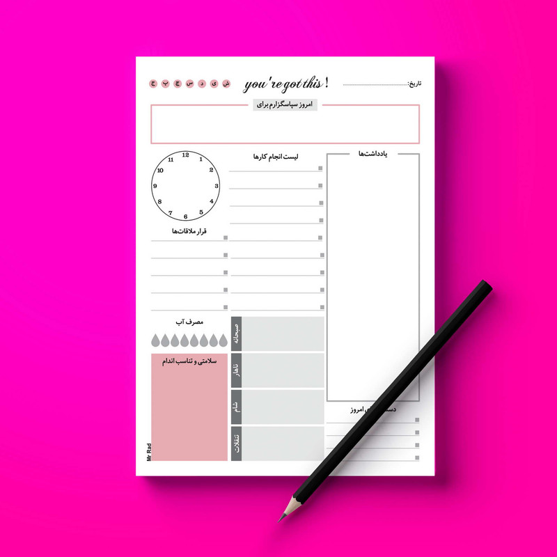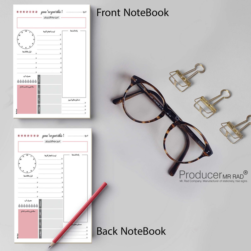 مستر راد با تیمی مجرب از متخصصین صنعت چاپ اقدام به تولید و چاپ کاغذ یادداشت مدل تایم باکس نموده است. همه عاشقان لوازم تحریر، دفتر ، کتاب و همه کسانی که بنا به موقعیت تحصیل یا شغلشان با دفتر و نوشت افزار زیاد سرو کار دارند، برای خرید کاغذ یادداشت به خصوصیات آن توجه و پس از بررسی کامل خرید میکنند. خصوصیاتی مثل کیفیت کاغذ، جنس و دوام، طراحی صفحات و... تأثیرگذار است. این محصول جدیدترین نوتپد برنامه ریزی هست که در هاروارد هم به عنوان اولین روش کاربردی در برنامه ریزی استفاده میشود. ایلان ماسک و بیل گیتس هم از این روش برای برنامه ریزی خود استفاده میکنند. شما نوت پد مستر راد میتوانید برنامه ریزی های روزانه خود را انجام دهید که این نت پد شامل قسمت هایی برای یادداشت، قرار ملاقات ها، مصرف آب روزانه، سلامتی و تناسب اندام، سپاسگزاری و دستاوردهای امروز و ... میباشد. قسمت پشت تایم باکس مست راد به صورت نقطه ای طراحی شده تا شما بتوانید یادداشت های روزانه خود را بنویسید و بهتر برنامه ریزی کنید.