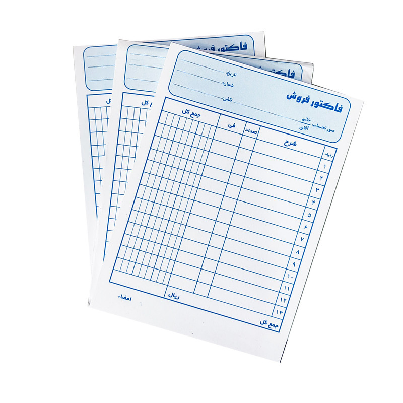 سایر توضیحات : فاکتور فروش هر کدام از ۱۰۰برگ کاغذ با کیفیت چاپ بالا به صورت ته چسب برای استفاده آسانتر درست شده است. این فاکتور شامل ۱۳ردیف و بدون کاربن می باشد.