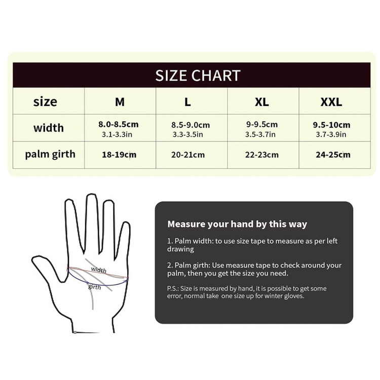 برای انتخاب بهتر سایز ، کف دست خود را با یک خط کش اندازه گیری نمایید و با جدول داخل عکسها مطابقت دهید.