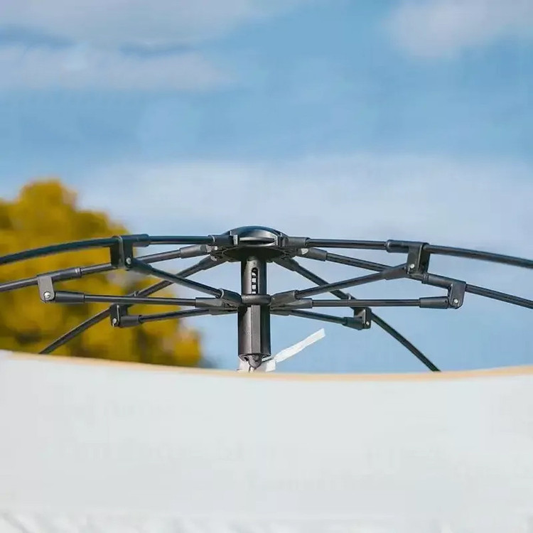 این محصول از سازه های اتوماتیک تشکیل شده است که راه اندازی آن در کم ترین تایم ممکن صورت می گیرد و می توان به راحتی نسبت به راه اندازی آن اقدام کرد.طراحی چادر به شکل گنبدی با ارتفاع زیاد بوده و در طراحی آن توجه ویژه ای به تهویه شده است.جنس پارچه بدنه چادر از آکسفورد 150D با روکش نقرهای است که نور را به خوبی بازتاب می دهد و اثر خنک کنندگی دارد.همچنین انتخاب پارچه آکسفورد پلیاستر 150D با روکش ضدآب و مقاوم در قسمت کف چادر باعث میشود که در صورت بارش باران،مانع از نفوذ رطوبت و آب از کف زمین به محیط داخلی چادر شود.