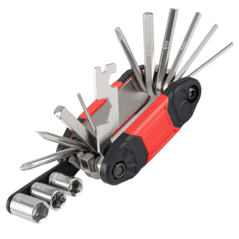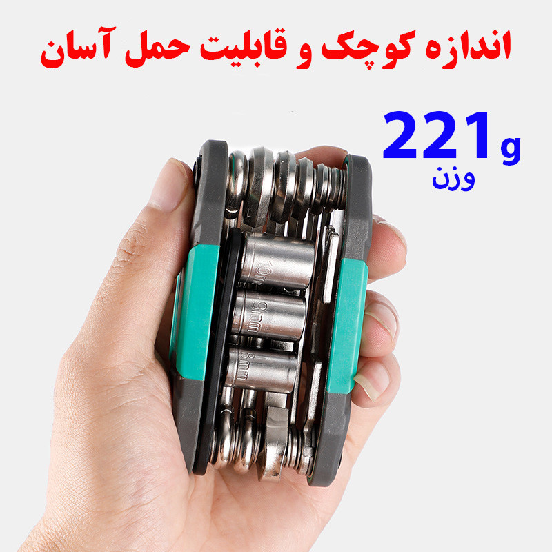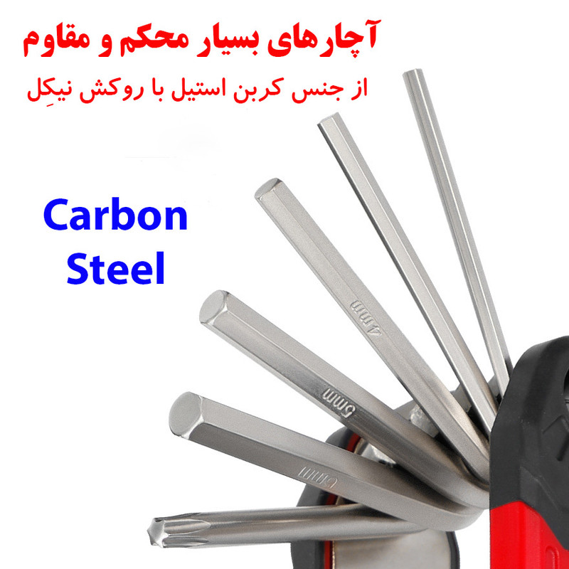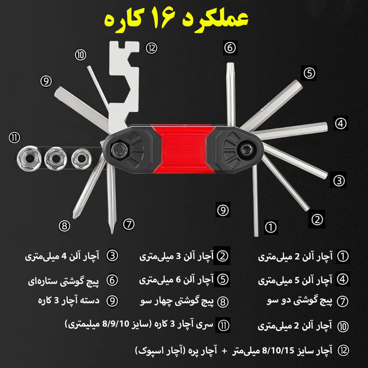 سایر توضیحات: جنس آچارها از جنس کربن استیل ضد زنگ با روکش نیکل - دارای 6 آچار آلن در سایزهای 1، 2، 3، 4، 5، 6، و 3 عدد آچار بوکس سایزهای 8، 9، 10 و 3 عدد آچار تخت در سایزهای 8، 10 ، 15 یک عدد پیچ گوشتی دوسو، چهارسو سایز PH1، ستاره ای و یک عدد آچار پره (اسپوک)