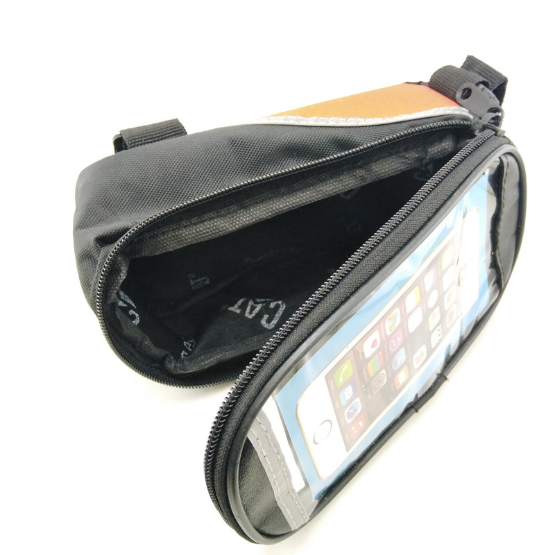 این کیف موبایل دوچرخه در روی خود دارای فضایی برای قرار دادن موبایل را دارد و صفحه رویی و نگهدارنده آن با پلاستیک شفاف مخصوص تاچ موبایل پوشیده شده است