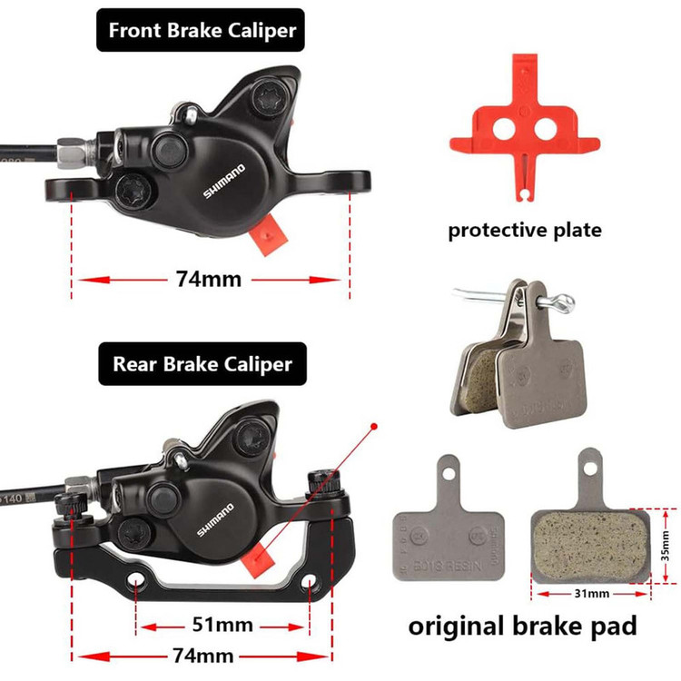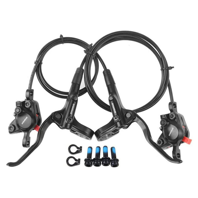 دسته ترمز هیدرولیک (Brake Levers) – شیمانو کالیپر ترمز هیدرولیک (Brake Calipers) – شیمانو شلنگ روغن ترمز (Hydraulic Hoses) پیچ های نصب کالیپر (Mounting Bolts) گیرههای نگهدارنده شلنگ (Hose Clips / Cable Clamps)