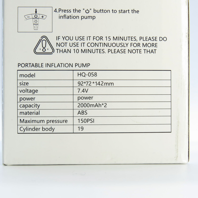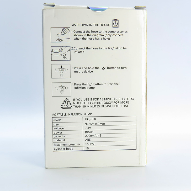 ولتاژ: 7.4 ولت باتری: دو عدد باتری داخلی با ظرفیت 2000 میلیآمپر (جمعاً 4000mAh) باد کردن تایر خودرو ،تایر موتور سیکلت و دوچرخه ، توپهای ورزشی (فوتبال، بسکتبال، والیبال و …) ،حلقه و وسایل بادی شنا ، بادکنکها